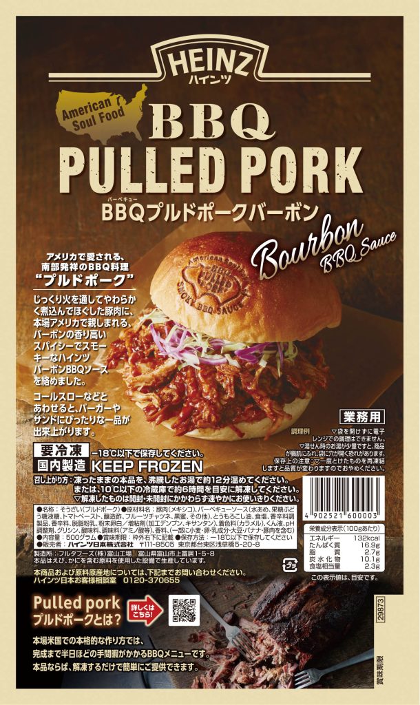 - じっくり火を通してやわらかくほぐした豚肉にフルーツの甘みとスパイスを効かせた、ハインツ 特製BBQソースを絡めた食べやすい商品です。
