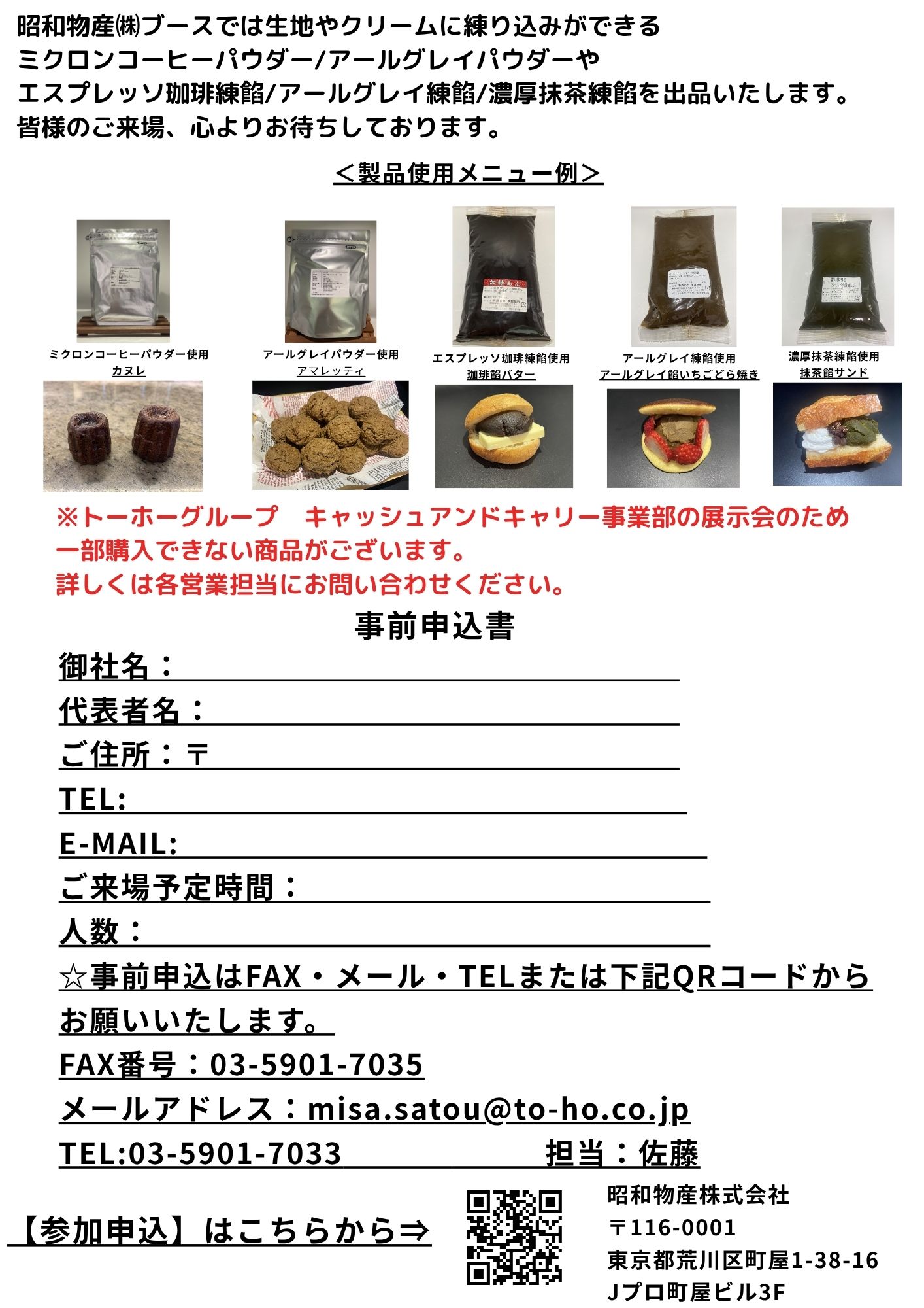 グループ会社主催 東京展示商談会に出展いたします! 2025年7月7日 開催・参加展示会 7月9日(水)グループ会社主催 東京展示商談会に出展いたします! ◆ミクロンコーヒーパウダーを使用した“エスプレッソホイップディップ アイスポッキー” ◆エスプレッソ珈琲練餡/アールグレイ練餡/濃厚抹茶練餡を使用した “和×洋デザートピザ” ◆ミクロンコーヒーパウダー/アールグレイパウダーを使用した“フィナンシェ”や“アマレッティ” など、外食様向けに【みんなでシェアできるデザートメニュー】をご提案を予定しております。 皆様のご来場心よりお待ちしております。
